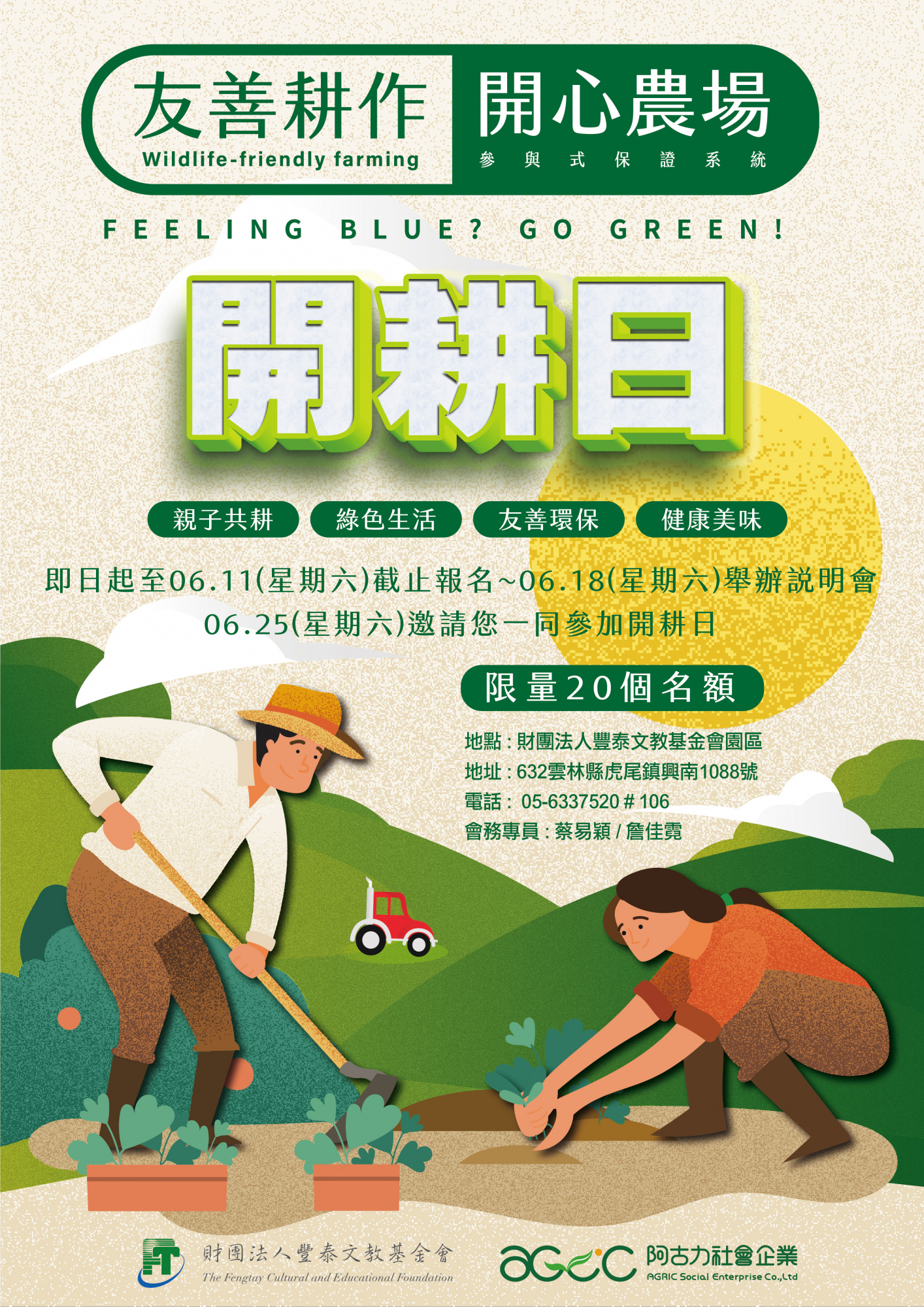 你有沒有曾夢想過,能夠在水泥都市裡耕耘一方小田地,栽種時蔬作物、體驗農事與享受收穫的喜悅呢?豐泰文教基金會在虎尾興南規劃了一座開心農場,邀請對於農事有興趣的朋友們,透過認養一塊園地,學習經營與照顧日常的蔬果作物,從中了解有機友善農法,重新建立起我們與土地的關係!