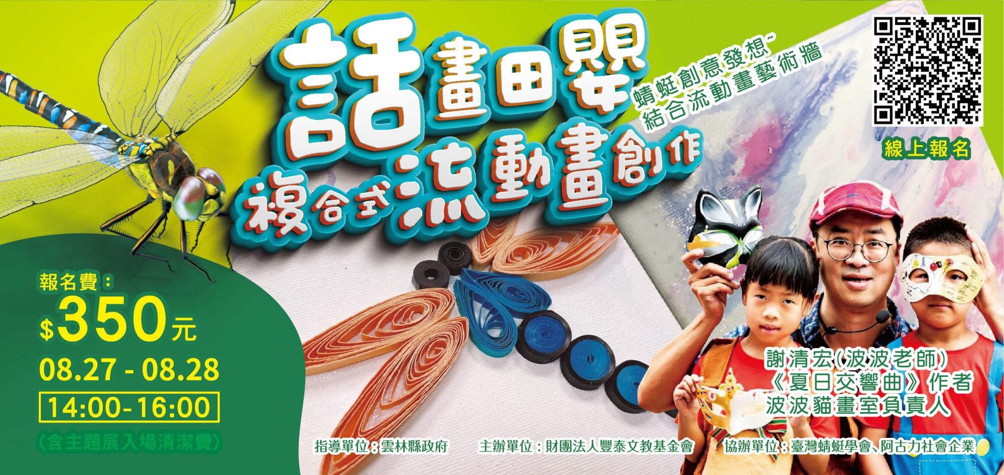 細細的身體、長長的翅膀,蜻蜓總是給人一種行動敏捷的印象!這次波波老師要帶領每位小小藝術家一起來認識蜻蜓,透過觀察、討論及繪畫,創作一隻隻獨一無二的蜻蜓,並將這些作品集結成本次蜻蜓展的主題彩繪牆!邀請大小朋友們一起來大顯身手!